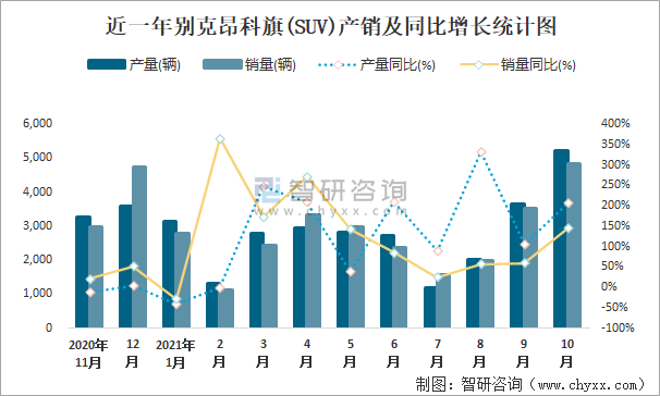 根據(jù)中國汽車工業(yè)協(xié)會數(shù)據(jù)可知:2021年10月別克昂科旗(SUV)產(chǎn)量為5224輛,同比增長207.1%,銷量為4824輛,同比增長144.6%,當(dāng)月產(chǎn)銷率為92.34%;2021年1-10月別克昂科旗(SUV)累計產(chǎn)量為27799輛,同比增長92%,累計銷量為26949輛,同比增長78.3%,累計產(chǎn)銷率為96.94%;2019-2020年別克昂科旗(SUV)產(chǎn)銷量有所增加,且近2年總產(chǎn)量大于總銷量,積壓了庫存94輛。