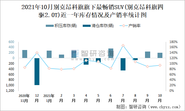 2021年10月別克昂科旗旗下最暢銷SUV(別克昂科旗四驅(qū)2.0T)近一年庫存情況及產(chǎn)銷率統(tǒng)計圖