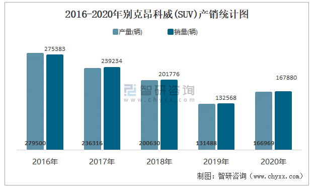 2016-2020年別克昂科威(SUV)產銷統計圖