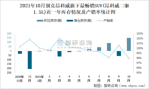 2021年10月別克昂科威旗下最暢銷SUV(昂科威二驅1.5L)近一年庫存情況及產銷率統計圖