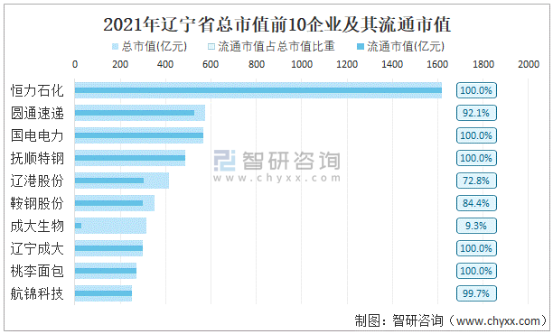 據同花順統計數據可知:截止至2021年12月31日,遼寧省總市值最高的企業是恒力石化,主要從事石油加工貿易行業,總市值為1616.88億元,其流通市值占總市值比重為100%;總市值排名前10的企業市值共計5149.48億元,占全省總市值的51.75%。
