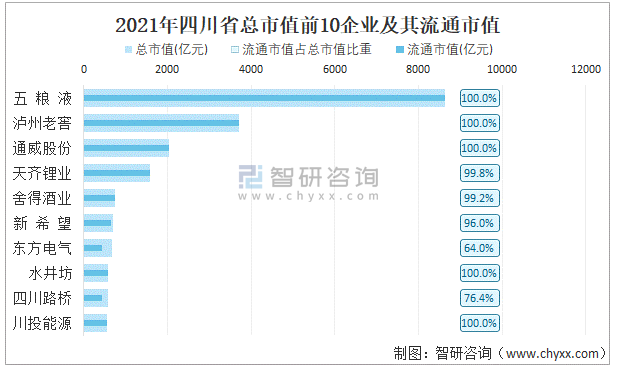 2021年四川省A股上市總市值前10強企業及其流通市值