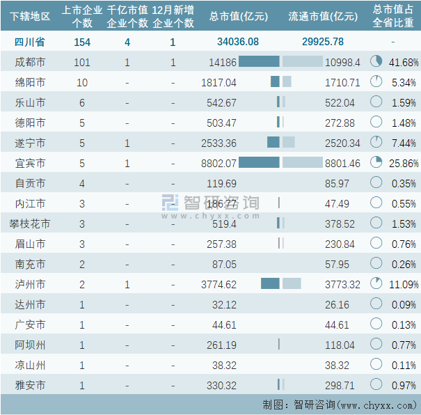 據同花順統計數據可知:截止至2021年12月31日,四川省的A股上市企業共計154家,上市企業數量排名全國第8,總市值共計34036.08億元,其中觀想科技1家企業為12月新在A股上市的企業;除廣元市、巴中市、資陽市、甘孜州4個地級行政區以外,四川省其他17個地級行政區均有企業在A股上市,其中成都市上市企業數量最多,為101家;四川省的A股上市千億市值企業數量在全國排名第8,共計4家,分布在成都市、遂寧市、瀘州市、宜賓市4個地區,其中成都市千億市值企業最多,為1家;成都市A股上市企業總市值總流通市值均為最高。