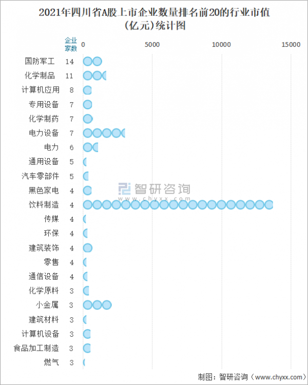 2021年四川省154家A股上市企業總市值34036.08億元,國防軍工行業上市企業最多