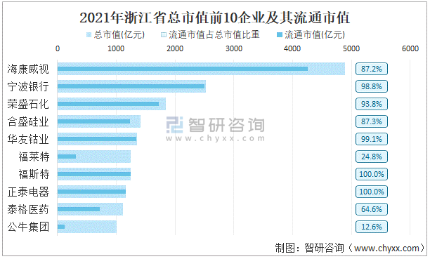 2021年浙江省A股上市總市值前10強企業及其流通市值