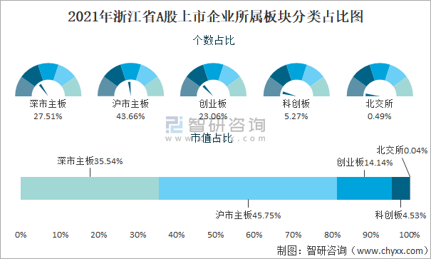 2021年浙江省A股上市企業所屬板塊分類占比圖
