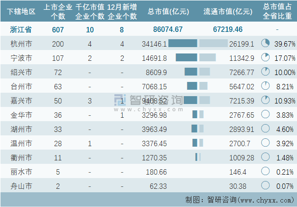 據同花順統計數據可知:截止至2021年12月31日,浙江省的A股上市企業共計607家,上市企業數量排名全國第2,總市值共計86074.67億元,其中喜悅智行、家聯科技、雅藝科技、百誠醫藥、禾邁股份、夢天家居、物產環能、永安期貨8家企業為12月新在A股上市的企業;浙江省下轄的11個地級行政區均有企業在A股上市,其中杭州市上市企業數量最多,為200家;浙江省的A股上市千億市值企業數量在全國排名第4,共計10家,分布在溫州市、寧波市、杭州市、嘉興市4個地區,其中杭州市千億市值企業最多,為4家;杭州市A股上市企業總市值總流通市值均為最高。