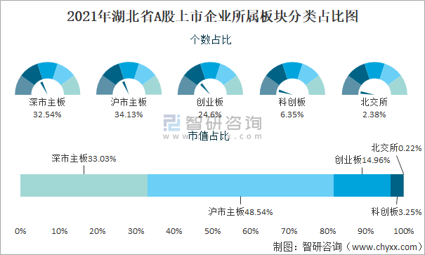 2021年湖北省A股上市企業(yè)所屬板塊分類占比圖