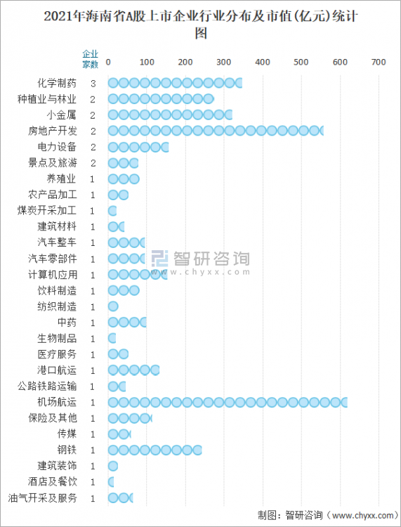 2021年海南省A股上市企業(yè)行業(yè)分布及市值(億元)統(tǒng)計(jì)圖