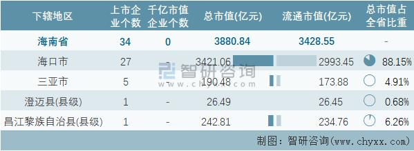 2021年海南省各地級(jí)行政區(qū)A股上市企業(yè)情況統(tǒng)計(jì)表