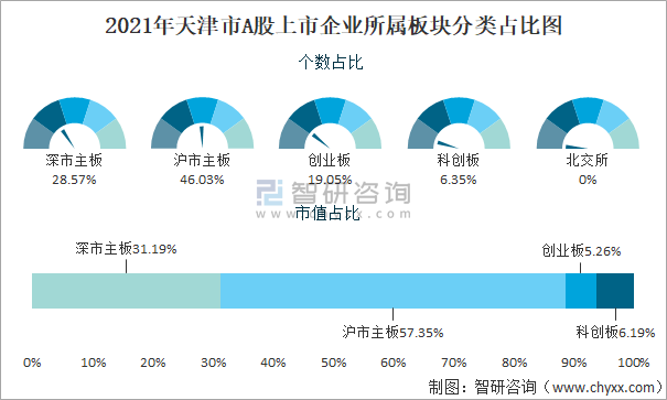 2021年天津市A股上市企業所屬板塊分類占比圖