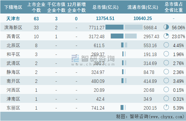 據同花順統計數據可知:截止至2021年12月31日,天津市的A股上市企業共計63家,上市企業數量排名全國第16,總市值共計13754.51億元;除河北區、寶坻區、紅橋區、大港區、漢沽區、塘沽區、寧河縣、河東區8個地級行政區以外,天津市其他10個地級行政區均有企業在A股上市,其中濱海新區上市企業數量最多,為33家;天津市的A股上市千億市值企業數量在全國排名第13,共計3家,分布在西青區、濱海新區2個地區,其中濱海新區千億市值企業最多,為2家;濱海新區A股上市企業總市值總流通市值均為最高。