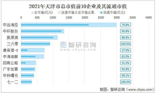 2021年天津市A股上市總市值前10強企業及其流通市值