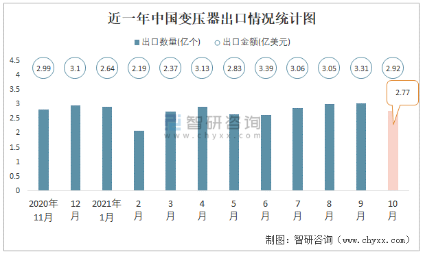 根據(jù)中國(guó)海關(guān)數(shù)據(jù)顯示:2021年10月中國(guó)變壓器進(jìn)口數(shù)量為0.81億個(gè),同比下降14.1%,進(jìn)口金額為0.62億美元,同比增長(zhǎng)20.3%,2021年10月中國(guó)變壓器出口數(shù)量為2.77億個(gè),同比增長(zhǎng)8.2%,出口金額為2.92億美元,同比增長(zhǎng)8.8%;2021年1-10月中國(guó)變壓器進(jìn)口數(shù)量為9.24億個(gè),進(jìn)口金額為7.13億美元,出口數(shù)量為27.56億個(gè),出口金額為28.9億美元。