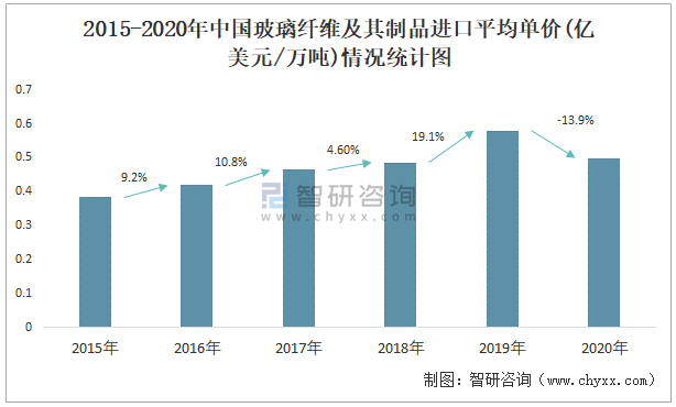 2015-2020年中國玻璃纖維及其制品進口平均單價(億美元/萬噸)情況統(tǒng)計圖