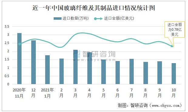 根據(jù)中國海關(guān)數(shù)據(jù)顯示:2021年10月中國玻璃纖維及其制品進口數(shù)量為1.29萬噸,同比下降0.6%,進口金額為0.78億美元,同比增長11.5%,2021年1-10月中國玻璃纖維及其制品進口數(shù)量為15.89萬噸,進口金額為9.06億美元。