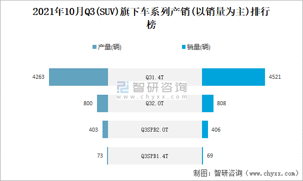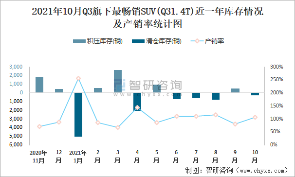 2021年10月Q3旗下最暢銷SUV(Q31.4T)近一年庫存情況及產(chǎn)銷率統(tǒng)計(jì)圖