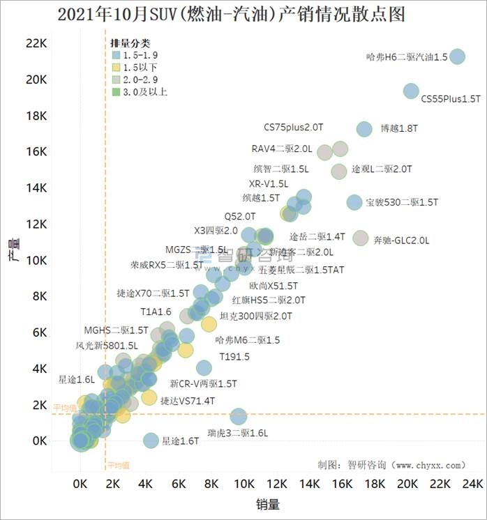 從下圖散點(diǎn)圖可看出,以產(chǎn)銷平均值作為四象限分界線,大部分燃油SUV集中在第一象限,即產(chǎn)多銷多,特別是哈弗H6二驅(qū)汽油1.5這款SUV,產(chǎn)量和銷量相對(duì)領(lǐng)先于其他燃油SUV;第三象限和第四象限SUV,其產(chǎn)銷率較高(散點(diǎn)大小代表了產(chǎn)銷率),說明大量產(chǎn)銷量不理想的SUV將庫存清理作為主要任務(wù),銷量排名靠前的SUV,以1.5-1.9和2.0-2.9排量為主。