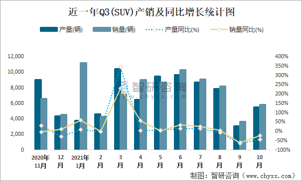 近一年Q3(SUV)產(chǎn)銷及同比增長統(tǒng)計(jì)圖