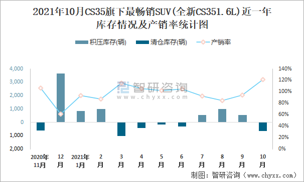 2021年10月CS35旗下最暢銷SUV(全新CS351.6L)近一年庫存情況及產銷率統計圖