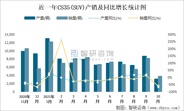 近一年CS35(SUV)產銷及同比增長統計圖