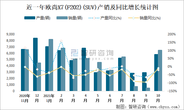 根據(jù)中國(guó)汽車(chē)工業(yè)協(xié)會(huì)數(shù)據(jù)可知:2021年10月歐尚X7(F202)(SUV)產(chǎn)量為5800輛,同比下降20%,銷(xiāo)量為6492輛,同比下降8.3%,當(dāng)月產(chǎn)銷(xiāo)率為111.93%;2021年1-10月歐尚X7(F202)(SUV)累計(jì)產(chǎn)量為48141輛,同比下降31.4%,累計(jì)銷(xiāo)量為46329輛,同比下降38.8%,累計(jì)產(chǎn)銷(xiāo)率為96.24%;且2020年歐尚X7(F202)(SUV)總銷(xiāo)量大于總產(chǎn)量,清倉(cāng)庫(kù)存1503輛。