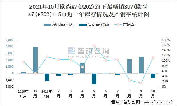 2021年10月歐尚X7(F202)旗下最暢銷(xiāo)SUV(歐尚X7(F202)1.5L)近一年庫(kù)存情況及產(chǎn)銷(xiāo)率統(tǒng)計(jì)圖