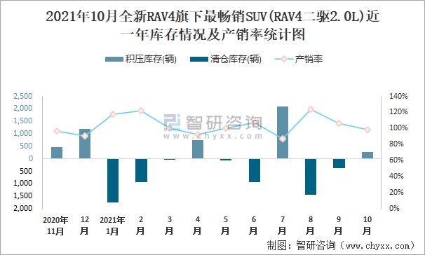 2021年10月全新RAV4旗下最暢銷SUV(RAV4二驅2.0L)近一年庫存情況及產銷率統計圖