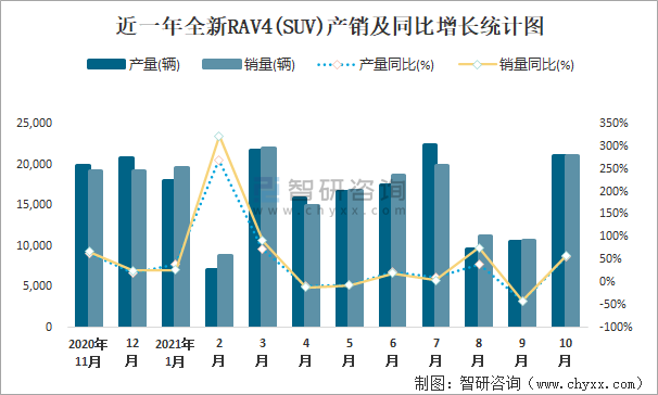 近一年全新RAV4(SUV)產銷及同比增長統計圖