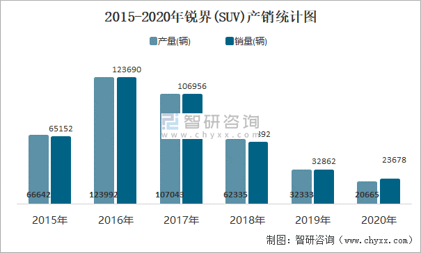 根據中國汽車工業協會數據可知:2021年10月銳界(SUV)產量為4427輛,同比增長96.4%,銷量為2629輛,同比增長6%,當月產銷率為59.39%;2021年1-10月銳界(SUV)累計產量為26476輛,同比增長80.5%,累計銷量為24993輛,同比增長40.1%,累計產銷率為94.4%;2015-2020年銳界(SUV)產銷量均在2016年達到最高值,此后逐年遞減,且近6年總產量大于總銷量,積壓了庫存780輛。