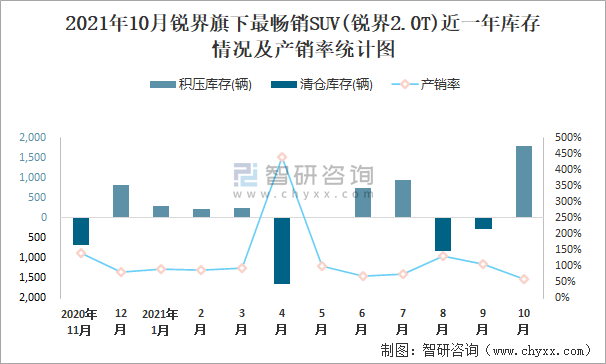 根據中國汽車工業協會數據統計可知:2021年10月銳界(SUV)旗下只有1款銳界2.0TSUV在銷售;近一年銳界2.0T共積壓庫存1637輛,其產銷率存在一定幅度波動,2021年4月產銷率最高(439.88%),清倉庫存1645輛,2021年10月產銷率偏低(59.39%),積壓庫存1798輛。