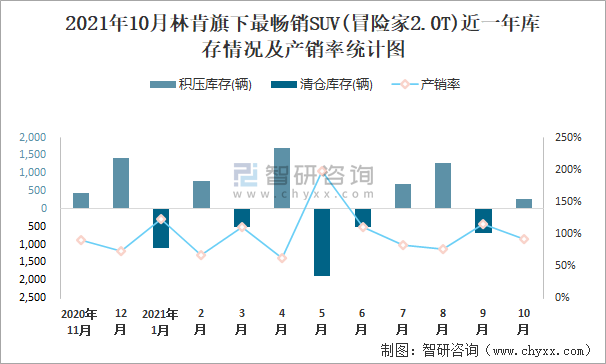 2021年10月林肯旗下最暢銷SUV(冒險家2.0T)近一年庫存情況及產銷率統計圖