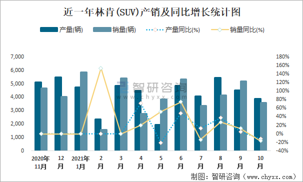 2021年10月林肯(SUV)產銷量分別為3868輛和3579輛 當月產銷率為92.53%