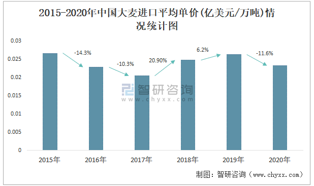 2015-2020年中國大麥進(jìn)口平均單價(jià)(億美元/萬噸)情況統(tǒng)計(jì)圖