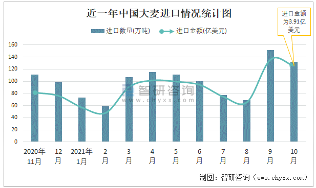 根據(jù)中國海關(guān)數(shù)據(jù)顯示:2021年10月中國大麥進(jìn)口數(shù)量為132萬噸,同比下降1.3%,進(jìn)口金額為3.91億美元,同比增長28.2%,2021年1-10月中國大麥進(jìn)口數(shù)量為994萬噸,進(jìn)口金額為27.97億美元。