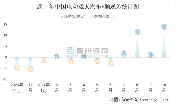 近一年中國電動載人汽車順逆差統計圖
