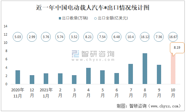 近一年中國電動載人汽車出口情況統計圖