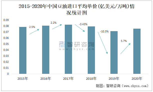 2015-2020年中國豆油進口平均單價(億美元/萬噸)情況統計圖