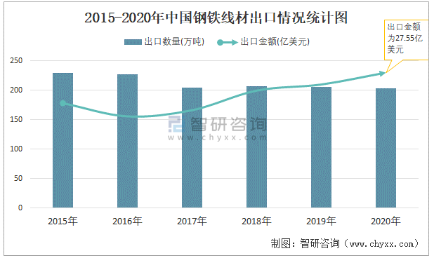 近一年中國鋼鐵線材出口情況統計圖