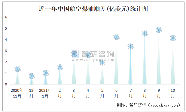 近一年中國航空煤油順差(億美元)統計圖