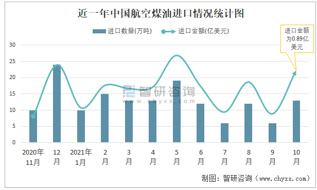 近一年中國航空煤油進口情況統計圖