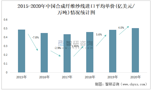 2015-2020年中國合成纖維紗線進口平均單價(億美元/萬噸)情況統計圖