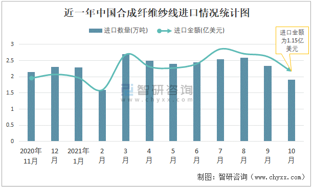 根據中國海關數據顯示:2021年10月中國合成纖維紗線進口數量為1.91萬噸,同比下降8.9%,進口金額為1.15億美元,同比增長19.1%,2021年1-10月中國合成纖維紗線進口數量為23.28萬噸,進口金額為12.55億美元。