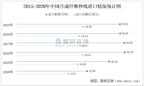 2015-2020年中國合成纖維紗線進口情況統計圖