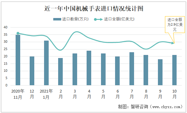 近一年中國機械手表進口情況統計圖