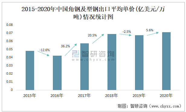 2015-2020年中國(guó)角鋼及型鋼出口平均單價(jià)(億美元/萬(wàn)噸)情況統(tǒng)計(jì)圖