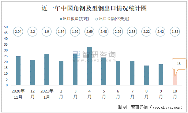 2021年10月中國(guó)角鋼及型鋼出口數(shù)量和出口金額分別為13萬(wàn)噸和1.83億美元