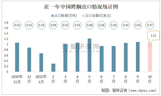 根據中國海關數據顯示:2021年10月中國烤煙出口數量為1.11萬噸,同比增長54.7%,出口金額為0.37億美元,同比增長77%;2021年1-10月中國烤煙出口數量為9.44萬噸,出口金額為2.93億美元。