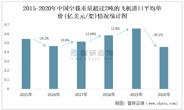 2015-2020年中國空載重量超過2噸的飛機進口平均單價(億美元/架)情況統計圖