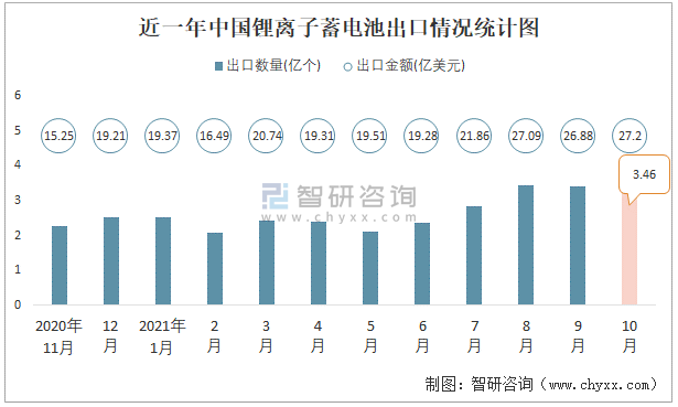 根據(jù)中國海關(guān)數(shù)據(jù)顯示:2021年10月中國鋰離子蓄電池進(jìn)口數(shù)量為1.37億個(gè),同比增長6.5%,進(jìn)口金額為3.41億美元,同比增長13.7%,2021年10月中國鋰離子蓄電池出口數(shù)量為3.46億個(gè),同比增長52.9%,出口金額為27.2億美元,同比增長68.6%;2021年1-10月中國鋰離子蓄電池進(jìn)口數(shù)量為12.65億個(gè),進(jìn)口金額為31.54億美元,出口數(shù)量為27.05億個(gè),出口金額為217.66億美元。